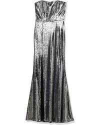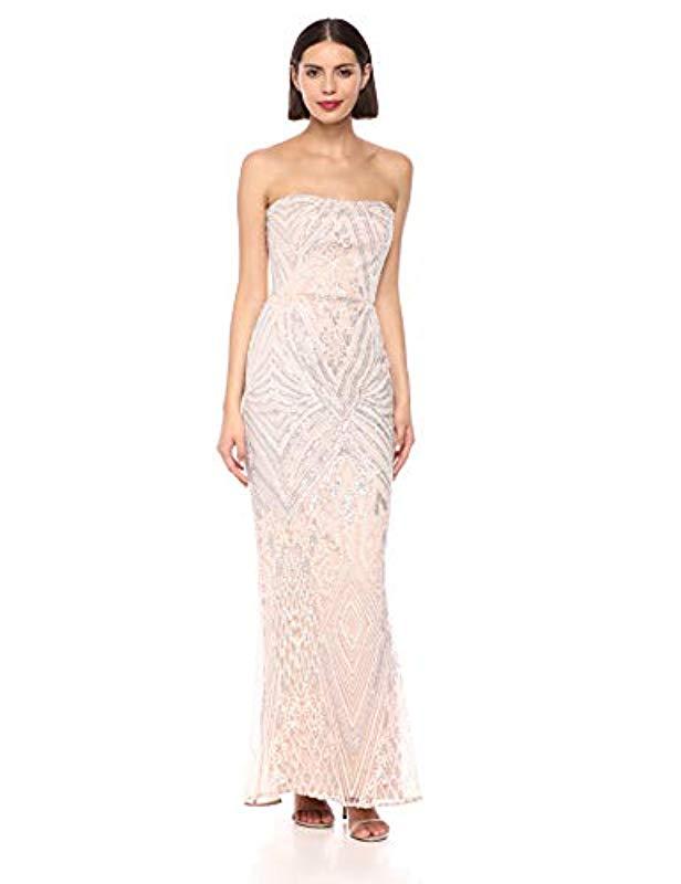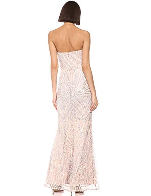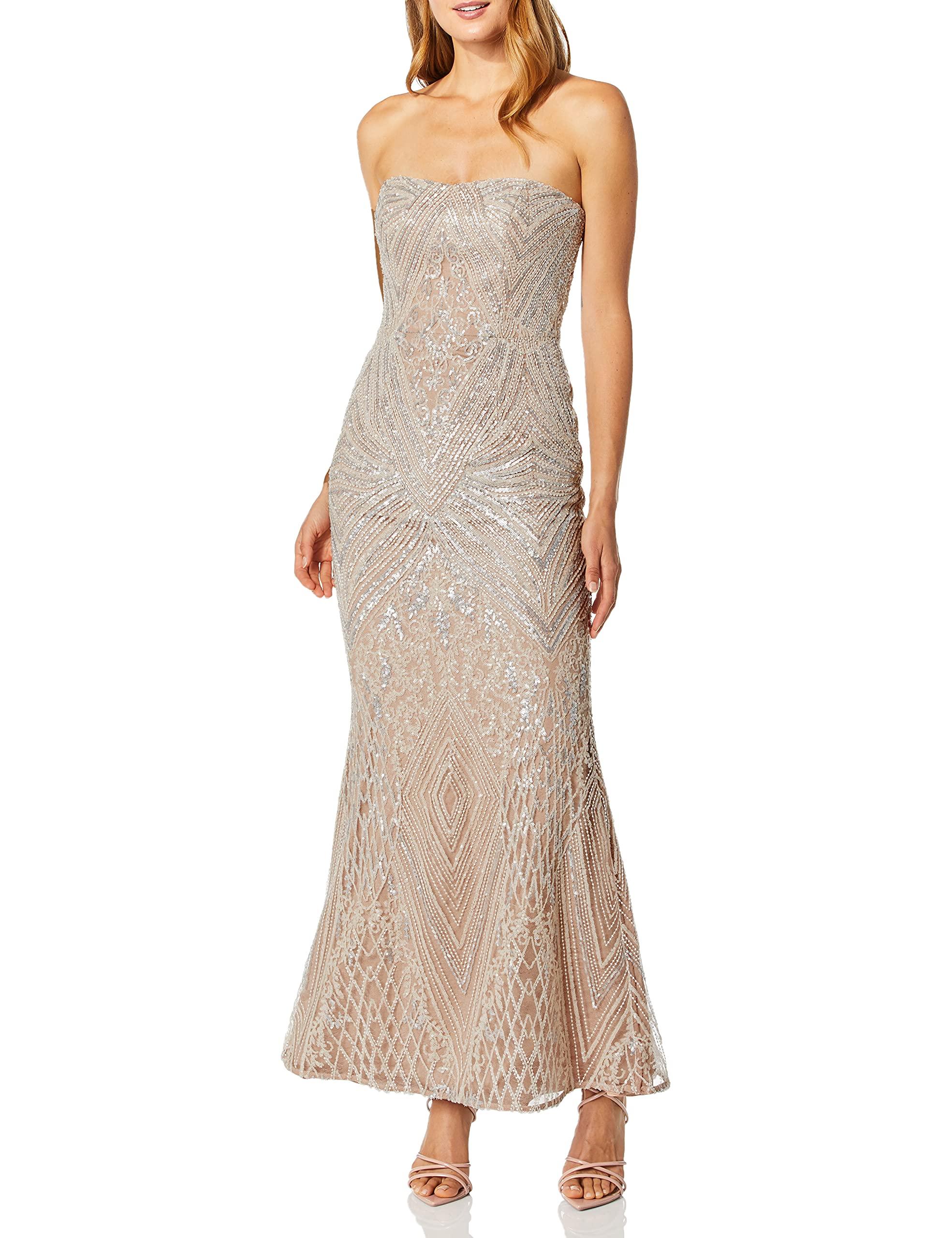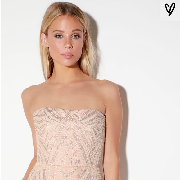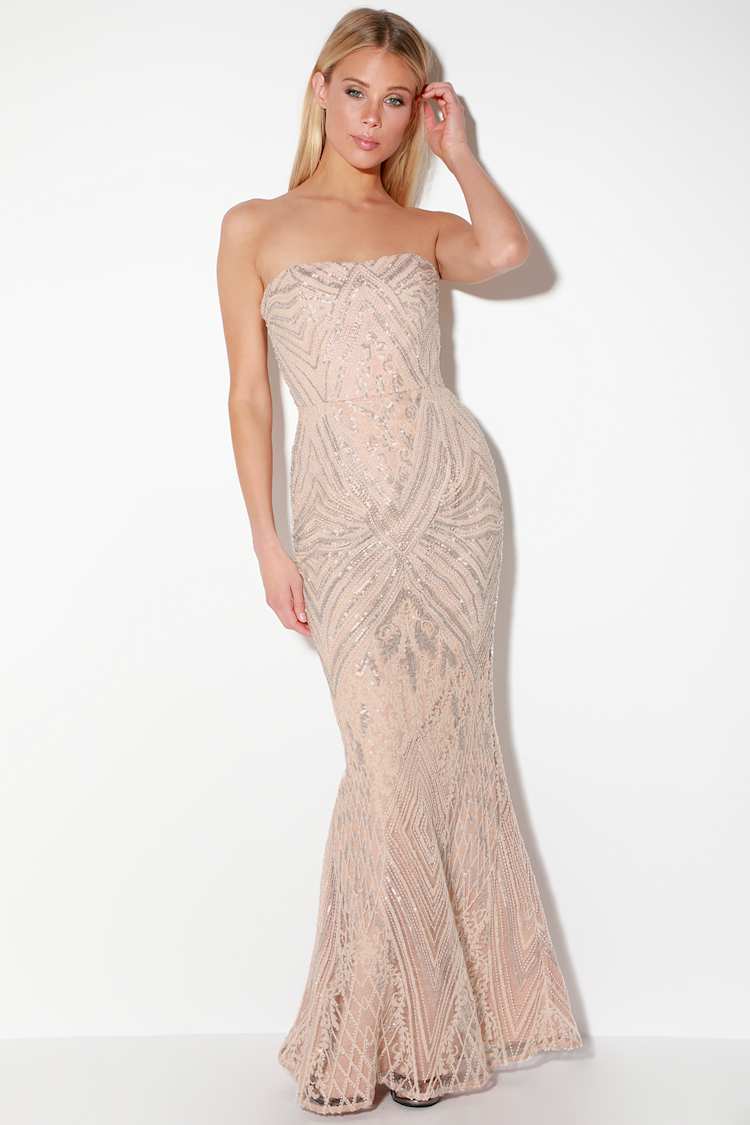 Gretta Blush Pink Sequin Strapless Maxi Dress. Dazzling nude and silver sequins create an art deco-inspired design atop this elegant gown with a strapless sweetheart bodice with no-slip strips.